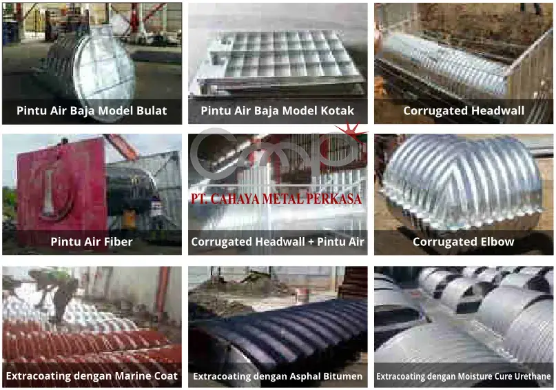Costum ProdukPT. Cahaya Metal Perkasa melayani beberapa produk Costum sebagai inovasi untuk menunjang produk utama yang diantaranya meliputi :Pintu Air Baja Model BulatPintu Air Baja Model kotakCorrugated HeadwallPintu Air FiberCorrugated Headwall + Pintu AirCorrugated ElbowExtracoating Dengan Marine CoatExtracoating Dengan Asphal Bitumen