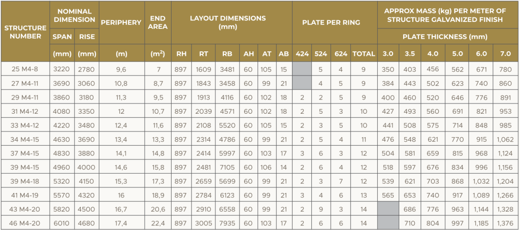 Dimensi spesifik yang cocok untuk kondisi ruang yang terbatas: contoh span 3220 mm hingga 6010 mm dan rise 2780 mm hingga 4680 mm.
