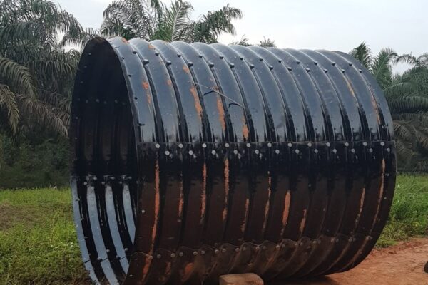Material plat baja bergelombang yang dilapisi galvanis dan dirakit dengan baut mutu tinggi (high tensile) → kekuatan struktur yang tinggi dan ketahanan terhadap korosi.
